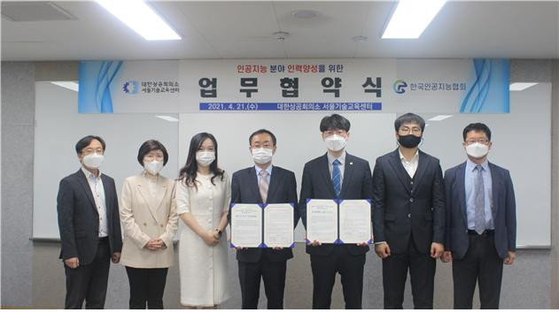 이날 협약식에는 대한상공회의소 서울기술교육센터의 이무상 센터장, 최민아 능력개발처장, 이준영 기업교육팀장, 박은경 HR혁신사업팀장과 한국인공지능협회 김현철 회장, 권영준 사무총장, 이종현 한국인공지능협회 이사 겸 미래전략사업단장 등이 참여했다.