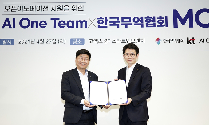 KT가 27일 서울 강남구 코엑스 스타트업 브랜치에서 한국무역협회와 ‘대한민국 인공지능 1등 국가 실현을 위한 개방형 혁신 생태계 조성’ 업무협약을 체결했다고 29일 밝혔다.