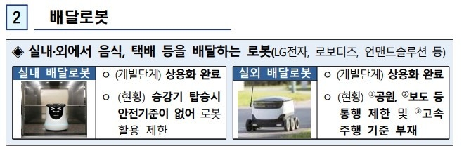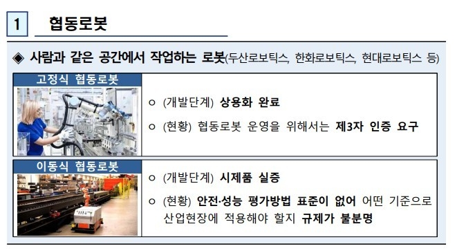로봇의 승강기 탑승, 협동 로봇 운영 인증 등 로봇산업 관련 규제는 당초 계획했던 시기보다 앞당겨 연내 개선을 완료하기로 했다.