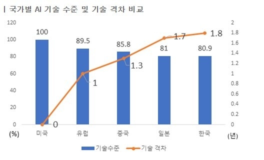 중국의 인공지능 기술 수준은 2020년 기준 미국(100)의 85.8%로 유럽(89.5%)에 이어 3위 수준이다. 우리나라는 미국 대비 80.9% 수준이다.