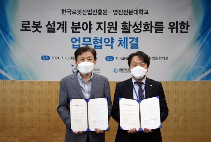 한국로봇산업진흥원과 영진전문대학교는 오는 13일, 업무협약을 체결하고, 로봇설계 분야 맞춤형 인재양성과 로봇기업의 설계 지원 산․학 협력 프로그램(로봇 HW설계 산학협력 지원사업)을 진행할 예정이다.