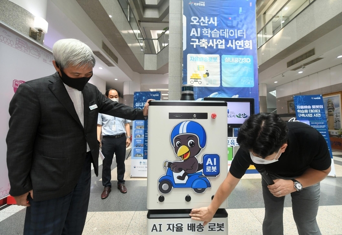 [더테크 뉴스] 오산시(시장 곽상욱)가 2021년도 인공지능 학습용 데이터 구축사업으로 추진 중인 로봇 자율배송 시범운행과 실내공간3D 제작 시연회를 12일 시청 로비에서 개최했다.