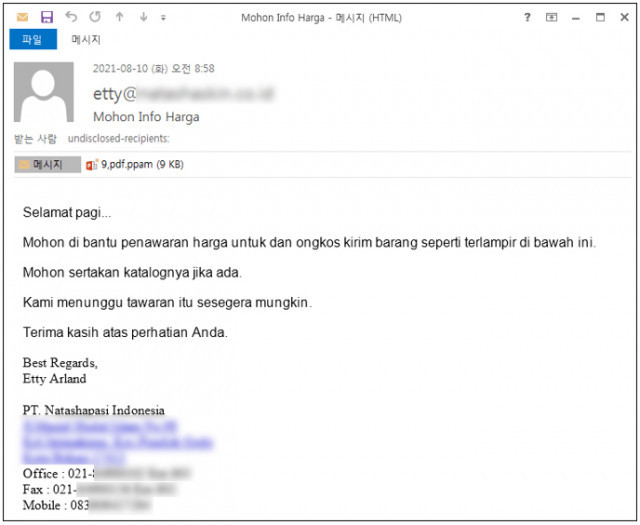 공격자는 먼저 인도네시아어로 ‘가격 정보를 부탁드립니다(Mohon Info Harga)’라는 제목으로 메일을 보냈다. 본문에도 인도네시아어로 ‘첨부된 상품 및 배송비 견적을 확인해달라(Mohon di bantu penawaran harga untuk dan ongkos kirim barang seperti terlampir di bawah ini)’며 첨부파일 실행을 유도했다. 첨부된 파일은 MS 파워포인트 프로그램에서 실행 가능한 PPAM 파일(.ppam)이다.