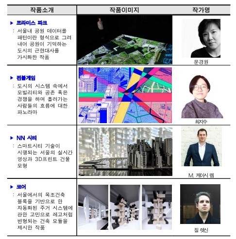 바래건축사사무소의 전진홍, 최윤희 공동대표가 큐레이터로 참여한 서울전에서는 그린 뉴딜 온실가스 감축전략, 스마트 모빌리티 체계 구축 등 급격한 도시 변화에 대응하는 서울시의 정책 및 프로젝트가 전시된다. 건축가와 작가들이 재해석해 새롭게 바라보는 서울을 담은 커미션 작가의 작품이 흥미를 더해줄 예정이다.
