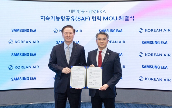 대한항공과 삼성E&A는 SAF 협력을 위한 양해각서(MOU)를 체결했다고 21일 밝혔다. 서울 강서구 대한항공 본사에서 진행된 행사에는 우기홍 대한항공 부회장, 남궁홍 삼성E&A 대표이사 사장 등이 참석했다.