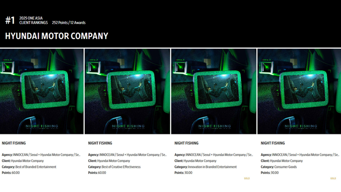 현대차그룹은 이 두 개의 최상위 타이틀에 더해 ‘올해의 최고 캠페인’과 ‘올해의 마케터’까지 거머쥐며 총 4관왕을 기록했다. 원 아시아 출범 이후 한국 기업이 브랜드·에이전시 부문을 동시에 석권한 것은 이번이 처음이다.
