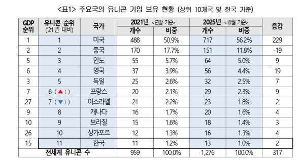 대한상공회의소는 5일 CB Insights의 글로벌 유니콘 기업 현황을 분석한 결과를 발표하면서, 한국 스타트업 생태계의 성장 정체가 뚜렷하게 나타났다고 평가했다. 올해 10월 기준 전세계 유니콘은 1,276개이며, 이 가운데 미국 기업이 717개(56.2%)로 절반을 넘었다. 코로나19 이후 4년간 미국 유니콘이 229개 늘어나 전체 증가분의 72%를 차지한 반면, 한국은 2개 증가에 그치는 등 가장 낮은 성장률을 기록했다. 중국이 19개 감소한 점을 제외하면 주요국 중 가장 부진한 흐름이다.