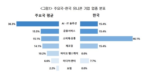 업종별 분포 역시 차이가 컸다. 유니콘 상위 10개국은 AI·IT 솔루션 기업 비중이 36.3%로 가장 높았지만 한국은 소비재·유통 업종이 46.1%에 달해 기술 중심 스타트업 육성이 시급한 상황이다.