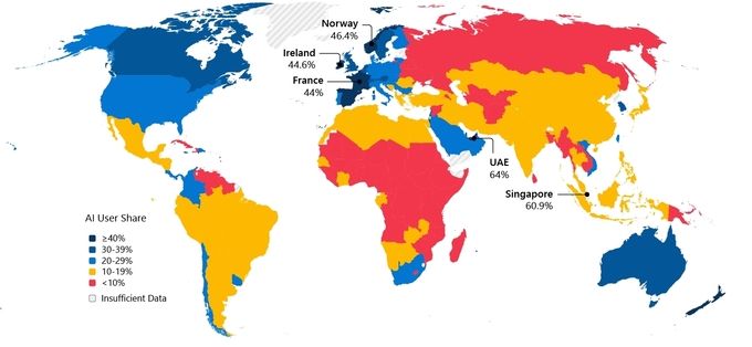 국가별로는 아랍에미리트(64.0%), 싱가포르(60.9%), 노르웨이(46.4%), 스페인이 상위권을 유지했다. 미국은 절대적인 사용량에서는 세계 최고 수준이지만 인구 대비 사용 비율이 낮아 24위에 머물렀다. 반면 한국은 근로 연령 인구의 30% 이상이 생성형 AI를 사용하며, 2024년 10월 이후 누적 성장률이 80%를 넘어 글로벌 평균과 미국을 크게 상회했다.