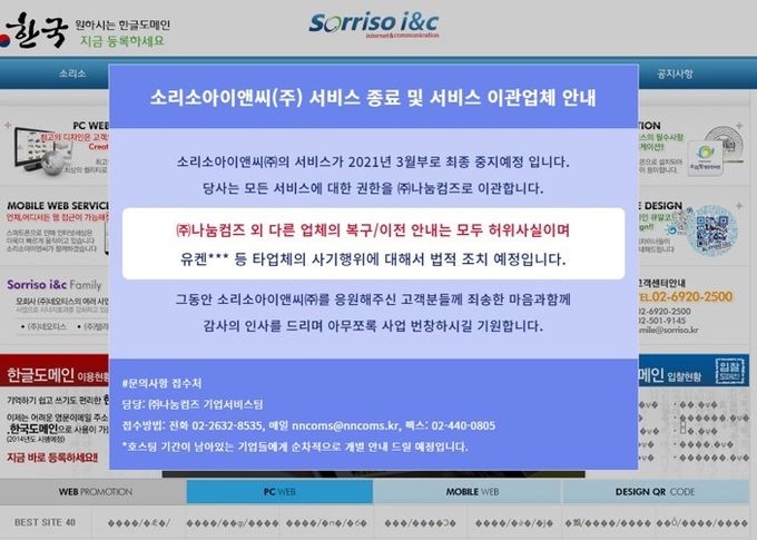 조 대표는 "최근 2개월 사이 소리소아이앤씨와 전혀 무관한 여러 업체들이 피해 고객들을 대상으로 기존 홈페이지를 그대로 복구해준다는 허위·과장 영업으로 2차, 3차 피해를 받고 있다"면서 "불법 영업행위 적발 시 민형사상 책임을 강력하게 물을 것"이라고 강조했다.