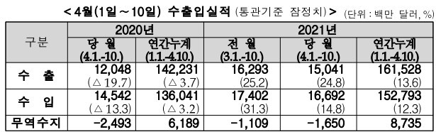 [더테크 뉴스] 4월 들어 10일까지의 수출이 지난해 같은 기관과 비교해 24.8%증가했다. 1일 평균수출액도 32.6%늘었다.