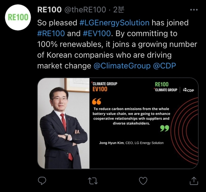 이와 함께 LG에너지솔루션은 글로벌 배터리 업체 중 최초로 EV100 가입도 진행했다. 동일 단체에서 진행하는 EV100은 2030년까지 기업 소유 및 임대 차량 중 3.5톤 이하 100%, 3.5~7.5톤 50% 차량을 친환경 차량으로 전환하는 캠페인이다. 올해 1월 기준 HP, DHL, IKEA 등 96개의 기업이 가입돼 있으며 국내 기업이 참여하는 것은 이번이 처음이다.
