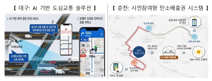 대구광역시는 실시간으로 교통상황을 관제하고 내비게이션으로 교통흐름을 분산시켜 도심교통을 개선하는 서비스를 제공할 예정이다. AI 기반의 신호 제어를 위해 경찰청과 업무협약도 맺었다.