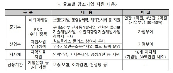 올해 지정된 글로벌 강소기업은 중앙정부-지자체-지역혁신기관-금융보증기관의 협력을 통해 향후 4년간 해외마케팅 지원과 연구개발(R&D) 참여 우대 및 맞춤형 패키지 지원을 받을 수 있다.