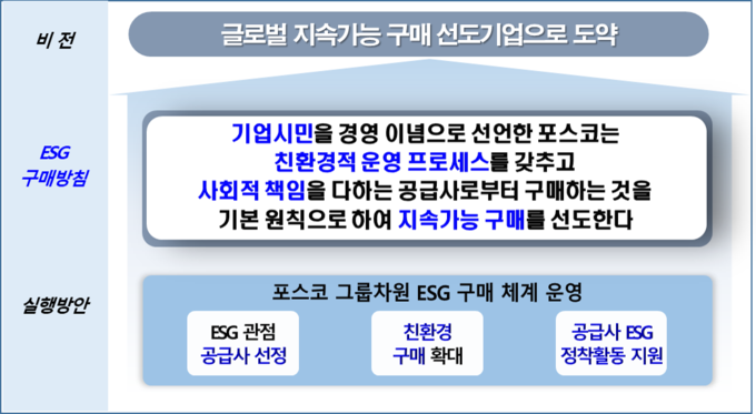 포스코는 경영이념인 기업시민의 5대 브랜드 중 ‘동반성장과 ‘탄소중립에 기반해, ‘친환경적이고 사회적 책임을 다하는 공급사로부터 구매하는 것을 기본 원칙으로 하여 지속가능한 구매를 선도한다’는 구매방침 하에 그룹 차원의 ‘포스코형 ESG 구매 체계’를 구축했다.