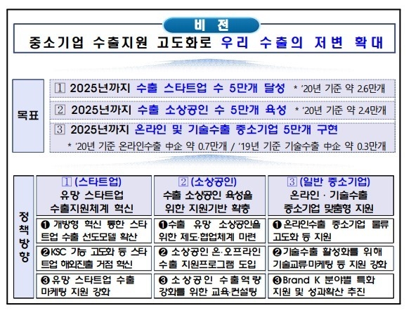 수출 스타트업 5만개, 수출 소상공인 5만개, 온라인 수출과 기술수출 중소기업 5만개를 육성한다는 계획이다. 이를 위해 금융·마케팅 지원 등 고도화하고 특히 온라인수출 중소기업의 물류고도화를 위해 공동물류센터를 활용하거나 물류센터를 건설한다.