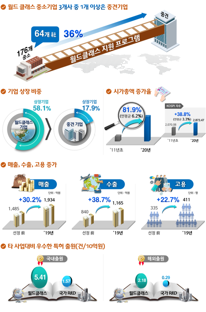 정부는 월드클래스 프로젝트 '11년 1단계 사업이 시작된 이후, 300여개 기업에 다양한 지원을 제공했고, 중소기업이었던 176개사 중 64개사(36%)가 중견기업으로 성장했다. 자동차, 반도체 등 국가 전략산업의 핵심주체로 성장하였으며, 반도체, 바이오 등 다양한 분야에서 월드클래스 기업 제품이 세계시장을 선도하고 신시장을 개척하는 성과도 창출했다. 기업 혁신·정책 지원으로 매출과 수출, 고용 등이 증가하였으며, 상장 기업의 경우 시가총액 증가율이 지난 10년간 81.9%에 달했다.