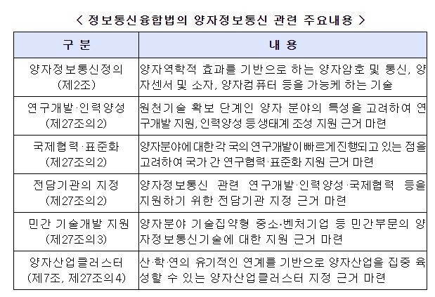 또 함께 시행되는 정보통신융합법 시행령에는 기술개발, 인력양성, 표준화 등 양자분야 진흥을 위한 부문별 사업을 추진하는 전담기관을 명시하고, 양자정보통신 산업협력지구 지정 시에 필요한 관계 중앙행정기관 및 지자체와의 협의 절차도 마련했다.