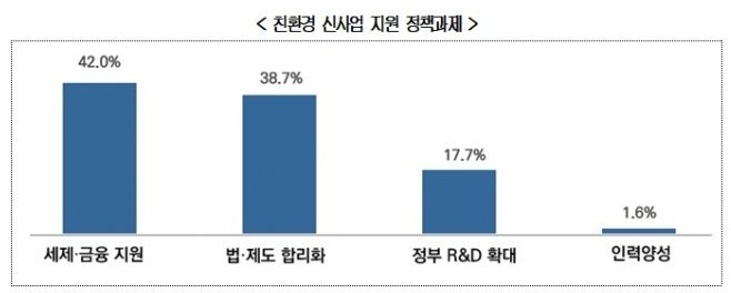 조사 결과, 친환경 신사업 추진과정에서 필요한 정책과제로 ‘세제·금융 지원’(42.0%)’을 가장 많이 꼽았다고 13일 밝혔다. 이어 ‘법·제도 합리화’(38.7%), ‘정부 R&D 확대’(17.7%), ‘인력양성’(1.6%)순으로 응답이 많았다.