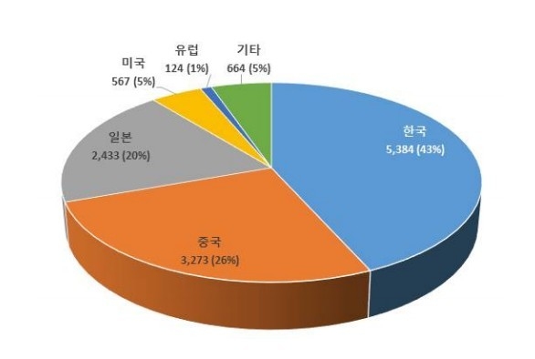 14일 특허청에 따르면 지식재산 선진 5개국(한국, 미국, 중국, 유럽, 일본) 특허 동향 조사(2011∼2020) 결과, 우리나라가 독보적인 1위(5,384건, 43%)였고, 중국이 2위(3,273건, 26%), 일본이 3위(2,433건, 20%), 미국이 4위 (567건, 5%)로 나타났다.