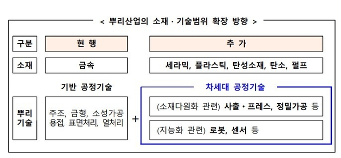 먼저 주조, 금속 소재와 관련된 6개 기반 공정기술에 소재 다원화와 지능화를 위한 차세대 공정기술을 추가한다. 여기에는 사출·프레스, 정밀가공, 로봇, 센서 등이 포함된다.