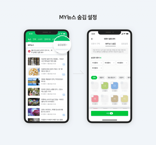 이용자는 MY 뉴스 상단 우측에 숨김 설정 화면에서 추천을 원하지 않는 언론사를 선택 가능하다. 해당 설정을 하면 추천 뉴스 영역인 'MY뉴스'와 '섹션별 헤드라인 뉴스'에서 해당 언론사의 기사가 제공되지 않는다.