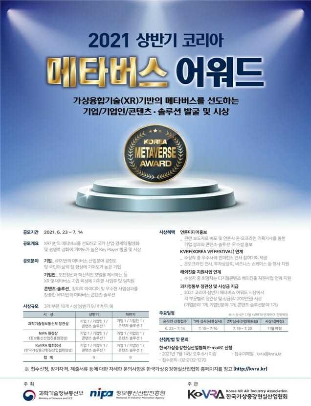 2021 코리아 확장가상세계 시상식은 상반기(6월), 하반기(11월) 총 2회로 진행되며, 이번 ‘2021 상반기 코리아 확장가상세계 시상식’은 6월 23일부터 7월 14일까지 공모가 진행된다.
