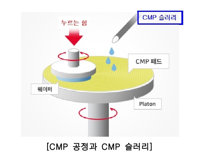 CPM슬러리는 반도체 소자는 다수의 얇은 막이 적층되어 있어 정밀도를 높이기 위해서는 막이 형성될 때마다 연마제와 패드를 이용하여 거친 면을 평탄화하는 공정이 필요한데, 이를 CMP 공정이라 하고, 이 때 사용되는 연마제다.