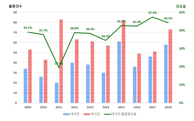 이 중 내국인의 출원 증가율은 6.1%로 외국인의 출원 증가율(3.6%)을 상회했고, 내국인의 출원 점유율은 2009년 39.1%에서 2018년에는 44.3%로 5.2%만큼 증가했다.