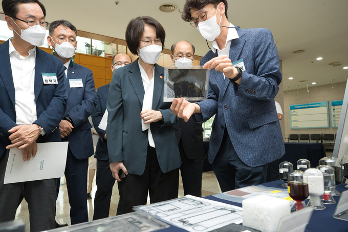 ![임혜숙 과학기술정보통신부 장관이 12일 오후 대전광역시 유성구 나노종합기술원에서 열린 '소부장 성과보고회' 에 참석해 '한국에너지기술연구원, 밀리미터파 특성맞춤형 복합소재 개발' 설명을 듣고 있다. [사진=과기정통부]](http://www.the-tech.co.kr/data/photos/20210728/art_16264204503808_51981c.jpg)