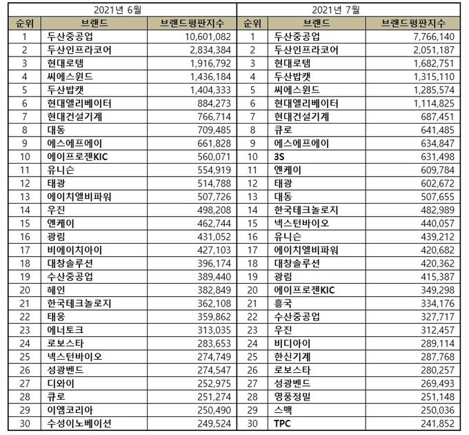 기계 상장기업 브랜드평판 2021년 7월 빅데이터 분석 30위 순위는 두산중공업, 두산인프라코어, 현대로템, 두산밥캣, 씨에스윈드, 현대엘리베이터, 현대건설기계, 큐로, 에스에프에이, 3S, 엔케이, 태광, 대동, 한국테크놀로지, 넥스턴바이오, 유니슨, 에이치엘비파워, 대창솔루션, 광림, 에이프로젠KIC, 흥국, 수산중공업, 우진, 비디아이, 한신기계, 로보스타, 성광벤드, 영풍정밀, 스맥, TPC 순이었다.