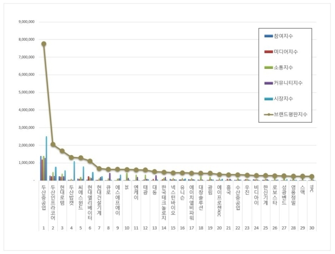 1위, 두산중공업 브랜드는 참여지수 1,396,060 미디어지수 1,183,677 소통지수 1,398,709 커뮤니티지수 1,283,707 시장지수 2,503,988이 되면서 브랜드평판지수 7,766,140으로 분석되었다. 지난 6월 브랜드평판지수 10,601,082와 비교하면 26.74% 하락했다.