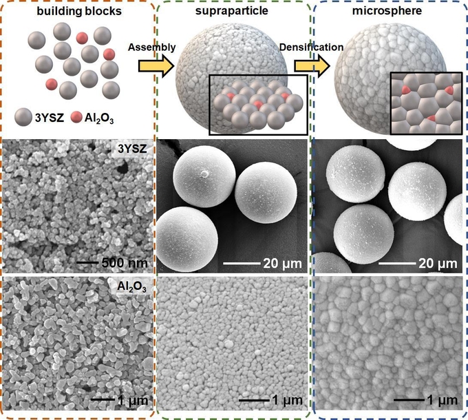 한국재료연구원(이하 재료연) 세라믹재료연구본부 기능세라믹연구실 민유호‧최종진 박사 연구팀이 쎄노텍과 공동연구를 통해 나노스케일의 지르코니아 초입자 조립제어기술을 개발하는데 성공했다. 또한 연구팀은 이를 고경도‧고밀도‧고탄성계수를 지닌 초소형 세라믹 마이크로입자로 변환하는 기술도 함께 개발했다.
