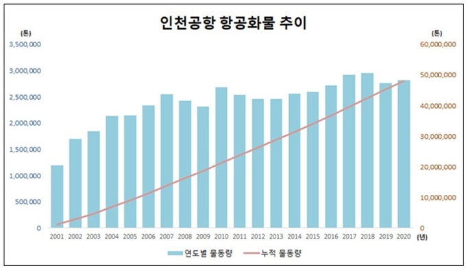 2001년 120만 톤이였던 인천공항 항공화물 물동량은 매년 실적이 점차 개선되면서, 2007년 255만 톤(‘01년 대비 113% 증가)까지 기록하였으나 2008년 미국 금융위기 여파로 물동량이 2009년 231만 톤까지 하락(’07년 대비 △9% 감소) 후 전세계 경기가 점차 회복했다.
