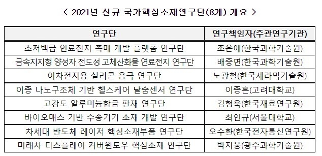 이번에 선정된 국가핵심소재연구단에는 백금을 촉매로 사용하는 '수소연료전지용 초저백금촉매 연구단'(카이스트)과 '이차전지용 실리콘 음극 연구단'(한국세라믹기술원), '바이오매스 기반 수송기기 소재 개발 연구단'(서울대) 등이 포함됐다.
