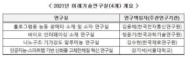미래기술연구실에는 '홀로그램용 광메타소재 연구실'(ETRI)과 '바이오 인터페이싱 소재 연구실'(KIST), '나노구조 기가 강도 알루미늄 연구실'(한국재료연구원), '인공지능-스마트랩 기반 산화물 고체전해질 혁신 연구실'(서울대) 등이 선정됐다.