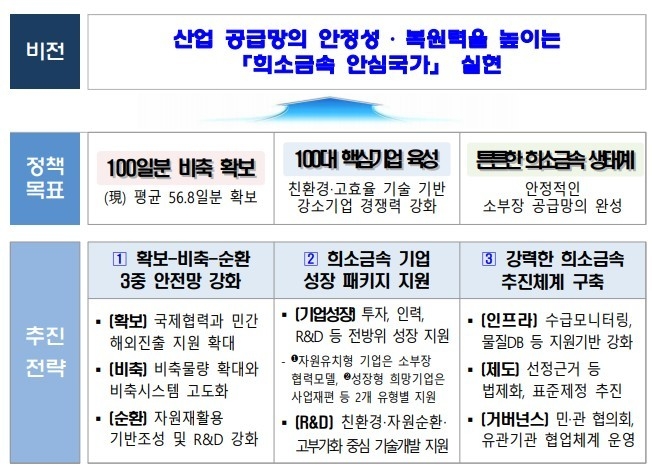 친환경‧고부가가치 기술을 기반으로 우리 희소금속 기업들이 독보적 경쟁력을 확보해 나갈 수 있도록 성장 주기별로 다양한 패키지 지원을 제공하고, 2025년까지 “희소금속 100대 핵심기업”을 발굴‧육성하여 희소금속 산업 생태계를 조성하는 것을 목표로 한다.