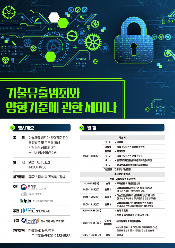 [더테크 뉴스] 특허청(청장 김용래)은 8월 13일 오후 2시 인터컨티넨털 서울 코엑스(서울 강남구)에서 국회 이학영 의원실과 한국지적재산권변호사협회 공동으로 ‘기술유출범죄와 양형기준 학술 세미나’(이하 ‘세미나’)를 개최한다고 13일 밝혔다.