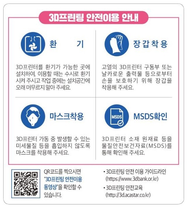과기정통부는 그 간 전문가 검토를 거쳐 △마스크ㆍ장갑 등 보호구 착용, △작업 시작 전부터 완료 후까지 주기적(최소 1시간 당 5분 이상) 환기, △물질안전보건자료(MSDS)를 통한 삼차원 프린팅 소재 원재료 확인 등 안전한 이용을 위한 안내 동영상과 주의사항이 표시된 스티커를 제작했다.
