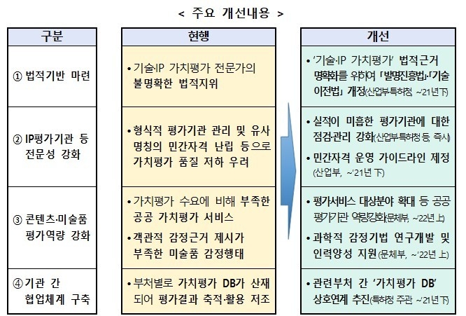 또 기술·IP 가치평가 전문성 강화를 위해 실적이 미흡한 평가기관과 다수 기관에서 유사 명칭으로 운영 중인 민간 자격제도에 대한 관리 강화를 통해 기술·IP 가치평가 전문성을 더욱 제고한다.