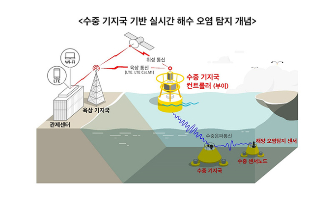 광안대교 인근 수중에 설치된 기지국과 해양 오염 탐지 센서를 탑재한 수중 센서 노드는 해양 오염을 10분 단위로 측정해, 센서에서 수중 기지국을 거쳐 해상 부이까지 음파 통신으로 전달한다.