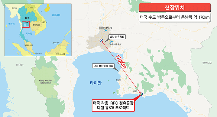 이번 사업은 2024년 유로(EURO)5 배출가스 규제 시행을 확정한 태국 에너지 산업부 정책에 따라, 기존에 생산되는 디젤의 황 함량을 유로(EURO)5 수준으로 낮추는 설비를 건설하고, 이와 연관된 각종 생산 설비를 고도화하는 프로젝트다.