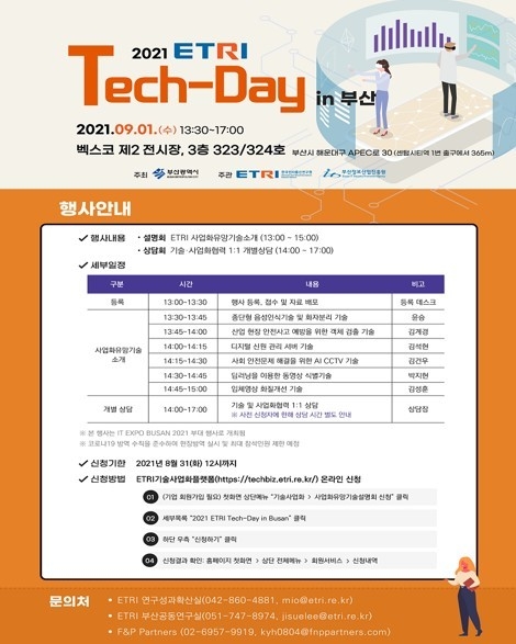 [더테크 뉴스] 부산시와 한국전자통신연구원(ETRI)는 9월 1일 오후 1시 해운대 벡스코에서 ‘2021 한국전자통신연구원 유망기술 설명회(2021 ETRI Tech-Day in Busan)’를 개최한다고 27일 밝혔다.