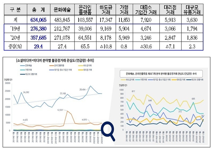 빅데이터 분석대상은 2년간(2019년~2020년) 언론‧SNS에서 언급된 불공정거래 관련 키워드를 포함한 데이터 약 63만 건이고, ’19년에는 불공정 언급 데이터량이 276,380건이었으나 ’20년에는 357,685건으로 29.4% 증가한 것으로 나타났다.