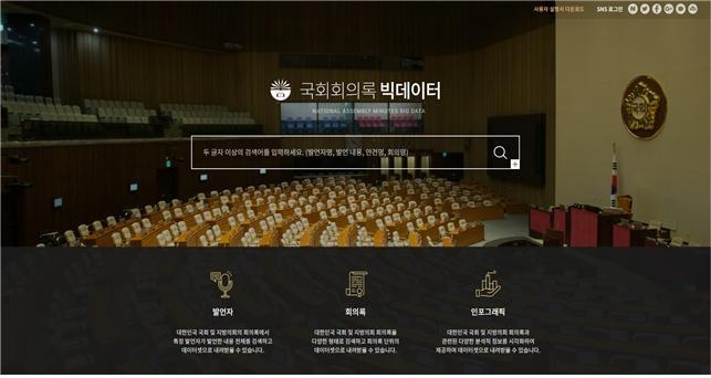 국회회의록 빅데이터 서비스는 제16대에서 제21대 국회까지 약 2만 건의 국회회의록 원문을 각 의원별 발언 단위로 분리해 구축한 1200만여 건의 데이터를 제공하고 있으며, 발언자나 키워드 등으로 쉽게 검색할 수 있을 뿐 아니라 의원별 발언 내용을 분석하여 시각화된 데이터를 제공한다.
