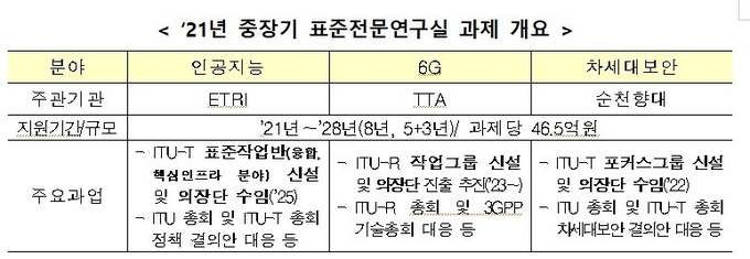 과기정통부는 올해 한국전자통신연구원(AI), 한국정보통신기술협회(6G), 순천향대(차세대 보안)를 인공지능, 6G, 차세대보안 등 3개 분야에 대한 표준전문연구실 주관기관으로 선정하였으며, 향후 8년(2021~2028) 동안 과제별로 약 46.5억원을 지원할 계획이다.