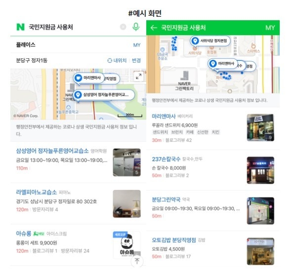 [더테크 뉴스] 네이버는 6일부터 ‘코로나 상생 국민지원금’ 사용 가능 업체를 ▲네이버앱 ▲네이버지도앱 ▲네이버 PC/모바일웹에서 간편하게 확인할 수 있다고 밝혔다.