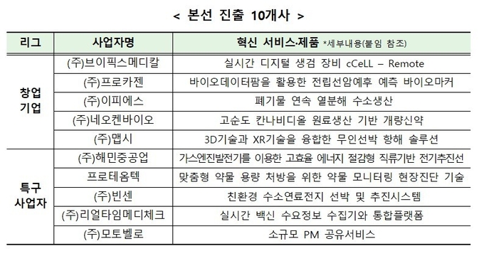 지역 예선 통과 기업을 대상으로 정책자금 심사를 중소벤처기업진흥공단에서 진행해 최종 10개사(특구사업자 5개사, 창업기업 5개사)가 본선 입상 후보에 올랐다.