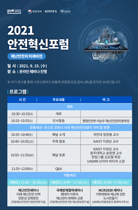 9월 13일부터 17일까지 개최되는 ‘2021 온라인 대한민국 안전산업박람회’와 연계해 개최되는 이번 포럼은 15일 오전 10시 30분부터 오후 5시 30분까지 온라인 생중계로 진행된다.