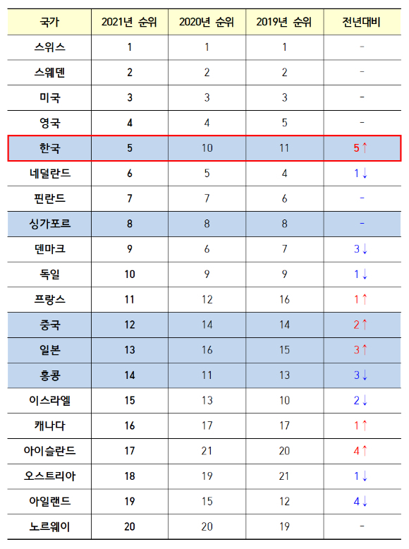 132개국을 대상으로 진행된 이번 평가에서는 스위스, 스웨덴, 미국, 영국이 지난해에 이어 올해도 1위부터 4위를를 차지했다. 아시아에서는 한국에 이어 싱가포르가 8위, 중국과 일본이 각각 12위, 13위를 차지했다.